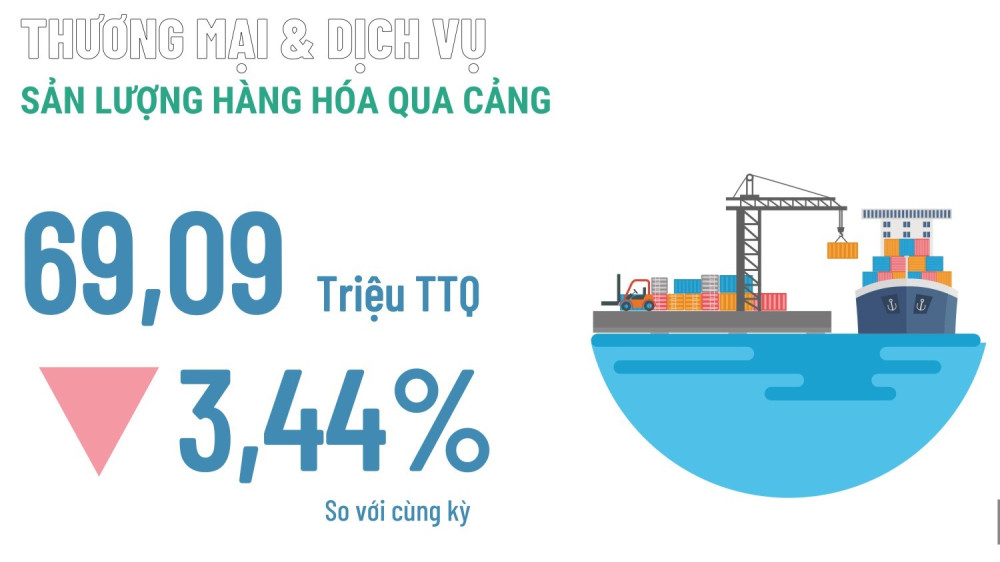 Sản lượng hàng hóa thông qua Cảng trên địa bàn thành phố ước đạt 69,099 triệu TTQ, giảm 3,44% so với cùng kỳ năm 2022. Doanh thu cảng biển 06 tháng đầu năm 2023 đạt 3.231,57 tỷ đồng, giảm 4,61% so với cùng kỳ năm 2022.