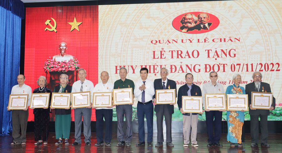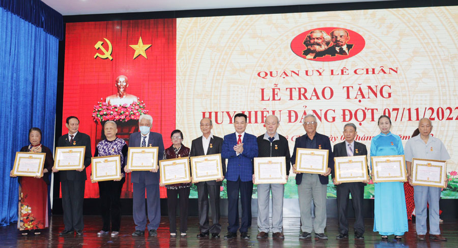 Phát biểu tại buổi trao tặng Huy hiệu Đảng, lãnh đạo Quận ủy Lê Chân chúc sức khỏe tới các đồng chí được trao tặng Huy hiệu Đảng và mong các đồng chí được trao tặng Huy hiệu Đảng tiếp tục nêu gương, giữ gìn, nâng cao bản lĩnh chính trị, phẩm chất đạo đức lối sống, gương mẫu trong công tác và cuộc sống, tiếp tục đóng góp công sức, trí tuệ vào việc thực hiện các nhiệm vụ chính trị của địa phương.
