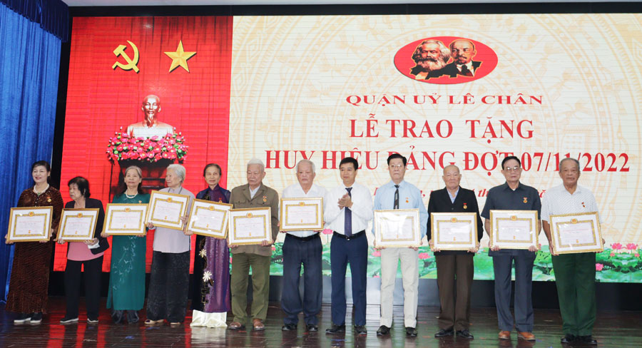 Đợt này, Đảng bộ quận Lê Chân có 157 đảng viên được nhận huy hiệu Đảng. Trong đó, tặng huy hiệu 75 năm tuổi Đảng cho 2 đồng chí; 65 năm tuổi Đảng cho 1 đồng chí; 60 năm tuổi Đảng cho 17 đồng chí; 55 năm tuổi Đảng cho 38 đồng chí; 50 năm tuổi Đảng cho 17 đồng chí; 45 năm tuổi Đảng cho 22 đồng chí; 40 năm tuổi Đảng cho 39 đồng chí; 30 năm tuổi Đảng cho 21 đồng chí.