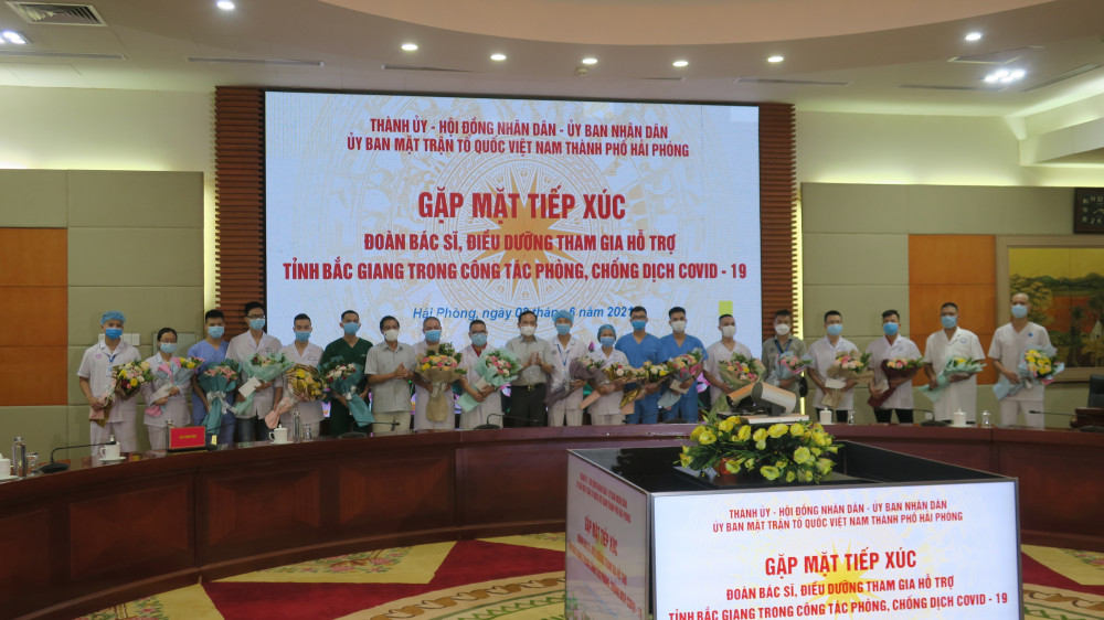 Sáng 2/6, Đoàn công tác gồm 18 cán bộ y tế của Hải Phòng lên đường chi viện cho tỉnh Bắc Giang chống dịch. Tới dự chương trình tiếp xúc động viên Đoàn công tác có các đồng chí: Trần Lưu Quang, Ủy viên Trung ương Đảng, Bí thư Thành ủy; Nguyễn Văn Tùng, Phó Bí thư Thành ủy, Chủ tịch UBND thành phố, cùng các đồng chí lãnh đạo HĐND, UBND thành phố.