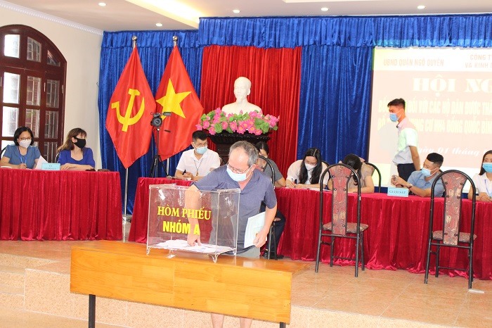 Chiều 1/9, tại hội trường UBND phường Đồng Quốc Bình, Sở Xây dựng, UBND quận Ngô Quyền phối hợp cùng công ty TNHH MTV Quản lý và Kinh doanh nhà ở tổ chức bốc thăm đối với các hộ dân được thành phố chấp thuận bố trí về chung cư HH4 Đồng Quốc Bình, phường Đồng Quốc Bình, quận Ngô Quyền.