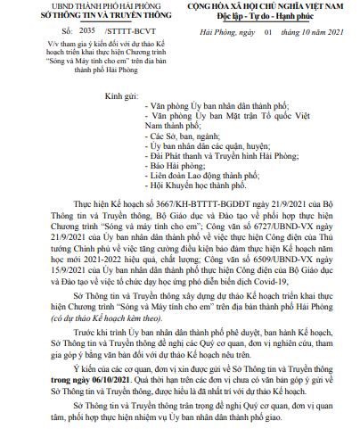 Công văn số 2035/STTTT-BCVT ngày 01/10/2021 của Sở Thông tin và Truyền thông V/v tham gia ý kiến đối với dự thảo Kế hoạch triển khai thực hiện Chương trình “Sóng và Máy tính cho em” trên địa bàn thành phố Hải Phòng