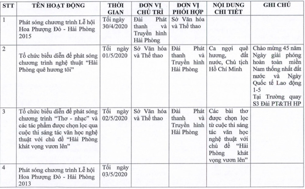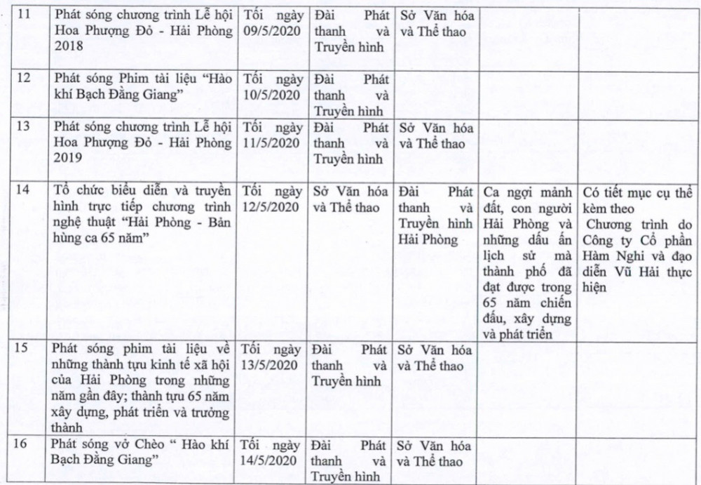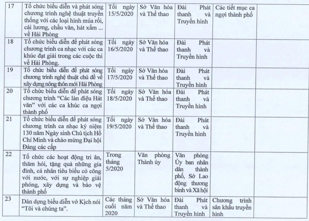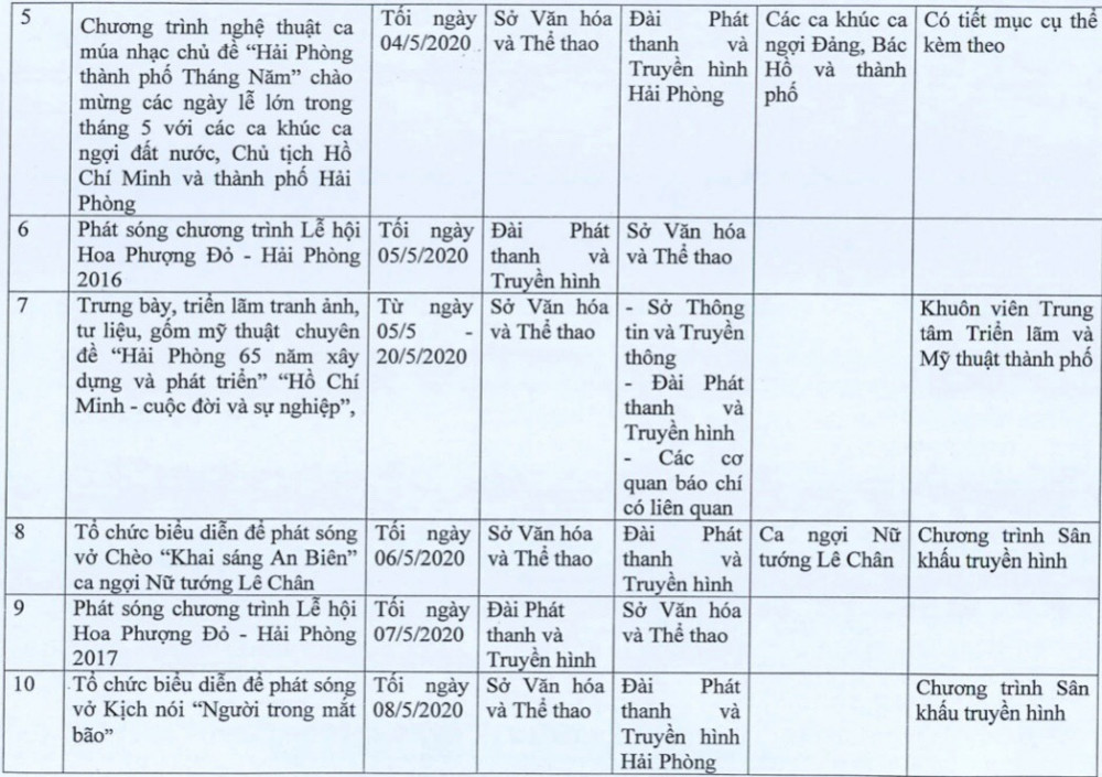Theo đó, UBND thành phố giao Sở Văn hóa và Thể thao chủ trì cùng Hội đồng Nghệ thuật thành phố, Đài Phát thanh và Truyền hình Hải Phòng, các cơ quan, địa phương, đơn vị liên quan phối hợp, tổ chức thành công các chương trình, nội dung hoạt động chào mừng các ngày lễ lớn trong tháng 5 và kỷ niệm 65 năm Ngày giải phóng Hải Phòng; lập và tổng hợp dự trù kinh phí trên cơ sở các hoạt động của các cơ quan, đơn vị tham gia gửi Sở Tài chính thẩm định.