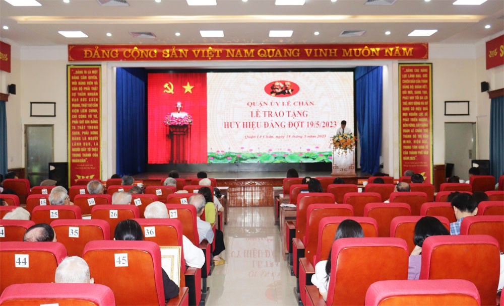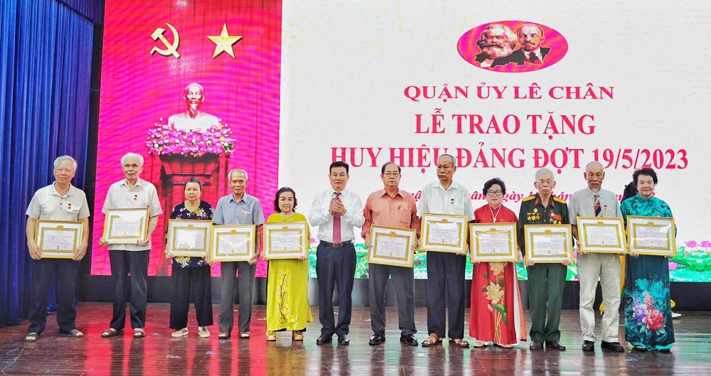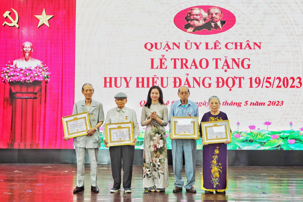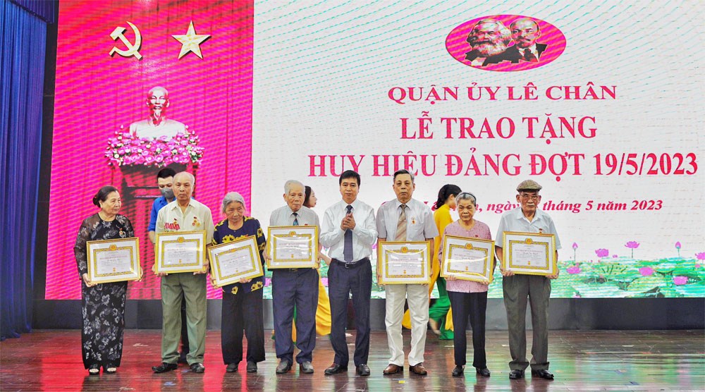 Đợt này, Đảng bộ quận Lê Chân có 247 đảng viên được trao tặng huy hiệu Đảng, trong đó: có 7 đồng chí được trao tặng Huy hiệu 75 năm tuổi Đảng, 2 đồng chí được trao tặng Huy hiệu 65 năm tuổi Đảng, 16 đồng chí được trao tặng Huy hiệu 60 năm tuổi Đảng, 70 đồng chí được trao tặng Huy hiệu 55 năm tuổi Đảng, 43 đồng chí được trao tặng Huy hiệu 50 năm tuổi Đảng, 24 đồng chí được trao tặng Huy hiệu 45 năm tuổi Đảng, 58 đồng chí được trao tặng Huy hiệu 40 năm tuổi Đảng, 25 đồng chí được trao tặng Huy hiệu 30 năm tuổi Đảng. Có 97 đồng chí thuộc diện trao tặng tại quận, các đảng viên sức khỏe yếu sẽ được Quận ủy tổ chức trao tặng tại gia đình.