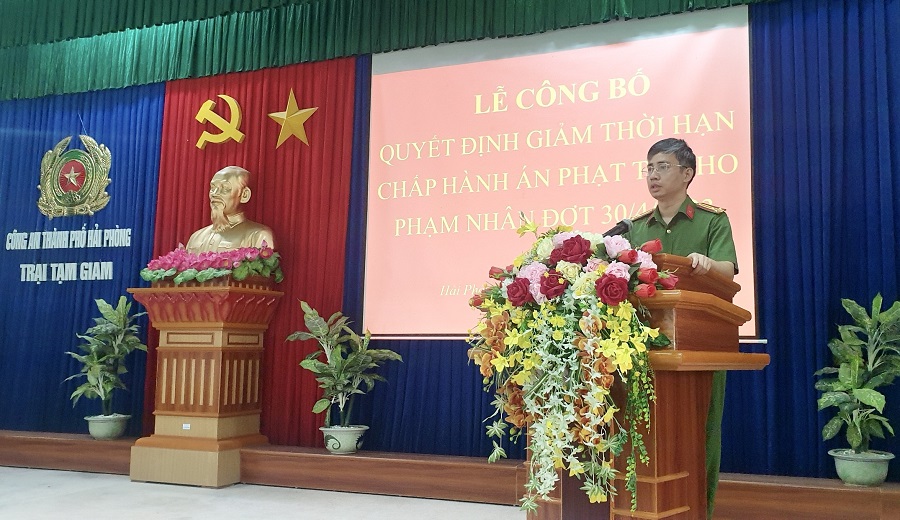 Sáng 27/4, Trại tạm giam Công an thành phố (CATP) Hải Phòng tổ chức Lễ công bố quyết định giảm thời hạn chấp hành án phạt tù cho phạm nhân đang chấp hành án tại Trại tạm giam đợt 30/4/2023.