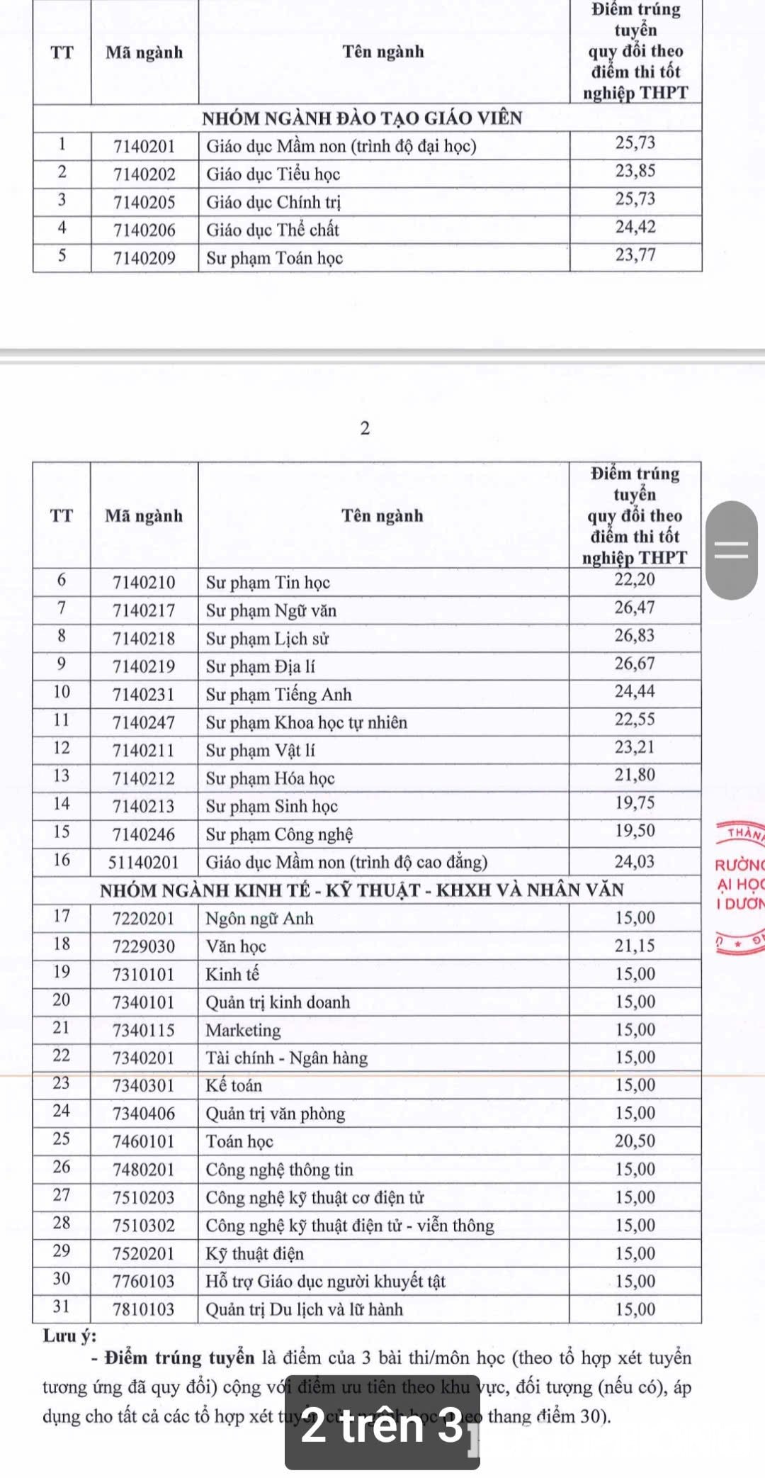 Tại Trường Đại học Hải Dương, 16 mã ngành sư phạm có điểm chuẩn từ 19 đến trên 26 điểm; trong đó, các ngành Sư phạm Lịch sử, Địa lý, Ngữ văn đều trên 26 điểm. Ngành Giáo dục mầm non (cao đẳng) lấy 24,03 điểm. Nhóm ngành kinh tế, kỹ thuật, khoa học xã hội và nhân văn lấy từ 15 điểm, riêng ngành Văn học 21,5 điểm và Toán học 20,5 điểm.