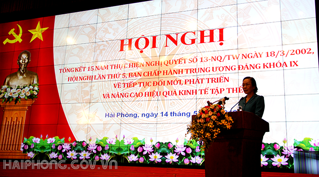 Sáng 14/5, tại Trung tâm Hội nghị thành phố,UBND thành phố tổ chức Hội nghị tổng kết 15 năm thực hiện Nghị quyết số 13/NQ/TW ngày 18/3/2002 Hội nghị lần thứ 5 Ban Chấp hành Trung ương Đảng khóa IX về tiếp tục đổi mới, phát triển, nâng cao hiệu quả kinh tế tập thể. Tới dự Hội nghị về phía Trung ương có các đồng chí: Cao Đức Phát, Ủy viên Ban Chấp hành Trung ương Đảng, Phó Trưởng ban Thường trực Ban Kinh tế Trung ương, Thành viên Ban Chỉ đạo tổng kết Nghị quyết số 13; Nguyễn Hiếu, Thứ trưởng Bộ Kế hoạch và Đầu tư. Về phía thành phố có các đồng chí: Nguyễn Thị Nghĩa, Phó Bí thư Thường trực Thành ủy, Trưởng đoàn Đại biểu Quốc hội thành phố Hải Phòng; Nguyễn Văn Thành, Ủy viên Thành ủy, Phó Chủ tịch UBND thành phố; lãnh đạo Ủy ban Mặt trận Tổ quốc Việt Nam thành phố; lãnh đạo sở, ban, ngành, địa phương, các đơn vị liên quan và hơn 150 Hợp tác xã (HTX) trên địa bàn thành phố.