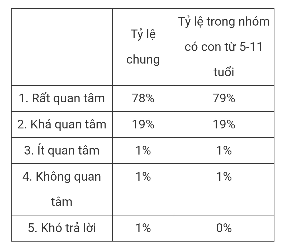 Mức độ quan tâm trong nhóm những người có con từ 5-11 tuổi khá tương đồng với tỉ lệ chung (79% những người trong nhóm này “rất quan tâm”).