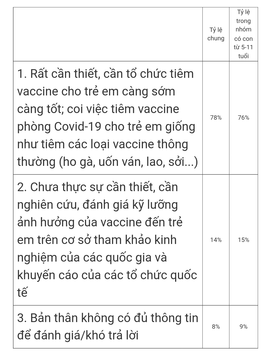 Kết quả thăm dò dư luận của Viện Dư luận xã hội, Ban Tuyên giáo Trung ương tại 63 tỉnh, thành trên cả nước cho thấy 78% ý kiến cho rằng tiêm vaccine phòng COVID-19 cho trẻ từ 5-11 tuổi là ‘Rất cần thiết, cần tổ chức tiêm càng sớm càng tốt’; 81% ý kiến ‘sẵn sàng đưa trẻ em đi tiêm vaccine phòng COVID-19’.