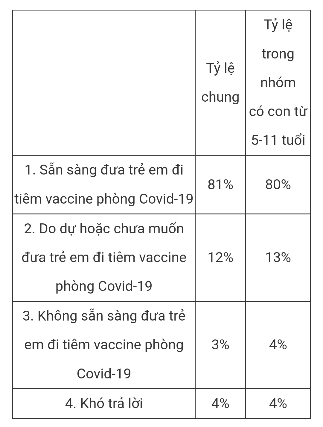 Kết qủa thăm dò về mức độ sẵn sàng đưa trẻ em từ 5-11 tuổi đi tiêm vaccine phòng COVID-19 cho thấy đại đa số ý kiến, 81% cho rằng họ “Sẵn sàng đưa trẻ em đi tiêm vaccine phòng COVID-19” nếu ngành Y tế tổ chức chiến dịch tiêm vaccine phòng COVID-19 cho trẻ em từ 5-11 tuổi trong thời gian tới. Tỷ lệ này trong nhóm những người có con trong độ tuổi từ 5-11 tuổi là 80%.