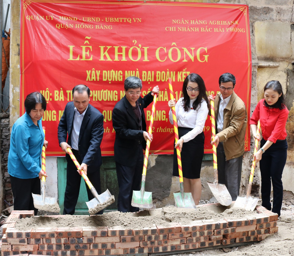 Sáng 22-3, Quận ủy-HĐND-UBND-UBMTTQ Việt Nam quận Hồng Bàng phối hợp với Ngân hàng Nông nghiệp và phát triển Nông thôn (Agribank) chi nhánh Bắc Hải Phòng tổ chức lễ khởi công xây nhà Đại Đoàn Kết tặng hộ bà Trần Phương Nga, ở số 11/13 Hoàng Diệu, phường Minh Khai, quận Hồng Bàng.