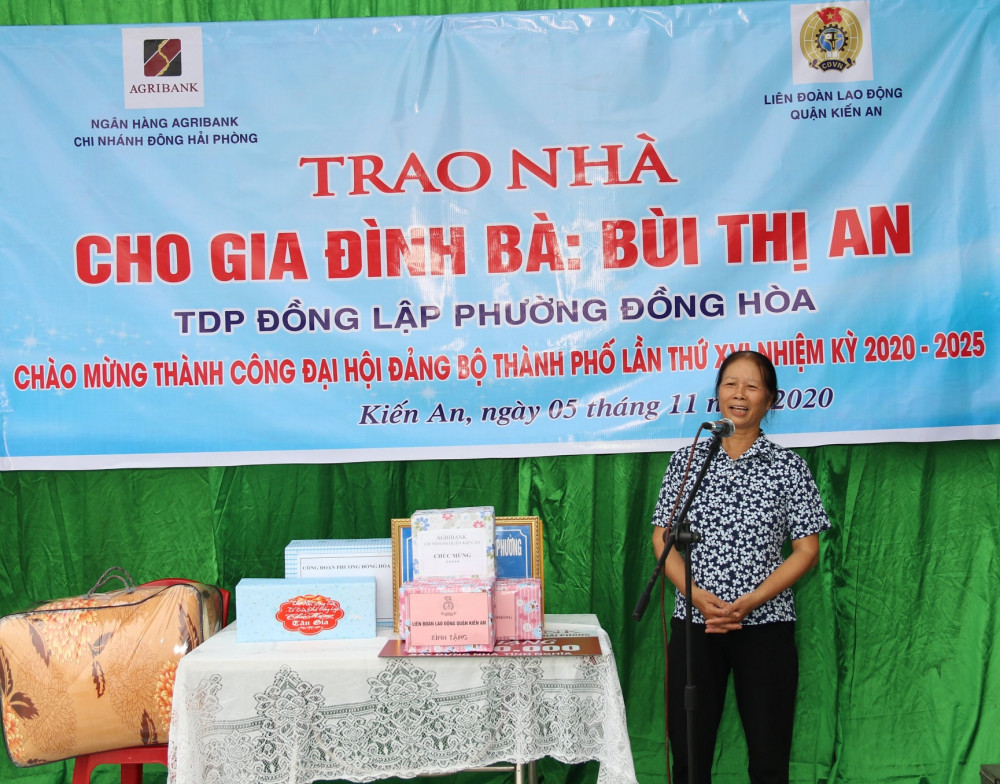 Chiều 5/11, Liên đoàn lao động (LĐLĐ) quận Kiến An, Agribank chi nhánh Đông Hải Phòng phối hợp với chính quyền địa phương tổ chức lễ bàn giao và đưa vào sử dụng nhà tình nghĩa tặng hộ bà Bùi Thị An, ở tổ dân phố Đồng Lập, phường Đồng Hòa, là gia đình có hoàn cảnh đặc biệt khó khăn của quận Kiến An.