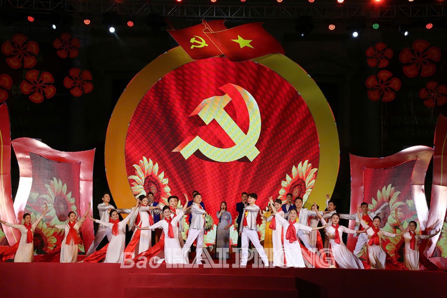 Chương trình nghệ thuật với kết cấu gồm 2 phần. Phần 1, “Vinh quang đời ta có Đảng, có Bác Hồ” với các bài hát, như: “Chào mừng Đảng Cộng sản Việt Nam – Lửa thiêng dân tộc” (sáng tác: Đỗ Minh, Đồng Dương Chiều), “Đảng như mặt trời, như người thân yêu” (sáng tác: Lê Đăng Vệ), “Lá cờ Đảng” (sáng tác: Văn Cao), “Bác Hồ một tình yêu bao la” (sáng tác: Thuận Yến)… là bản hùng ca vui tươi, khỏe khoắn ca ngợi công lao của Chủ tịch Hồ Chí Minh kính yêu và Đảng Cộng sản Việt Nam quang vinh.