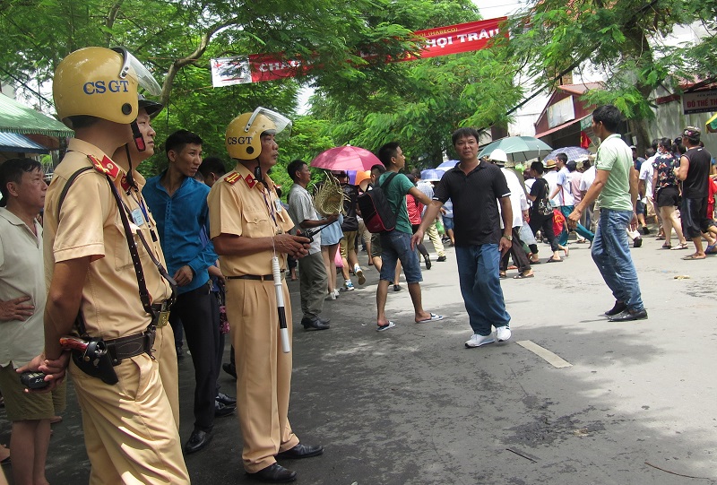 Lực lượng cảnh sát giao thông điều tiết phương tiện bên ngoài sân vận động quận Đồ Sơn, nơi diễn ra lễ hội chọi trâu (Ảnh: Phan Tuấn)