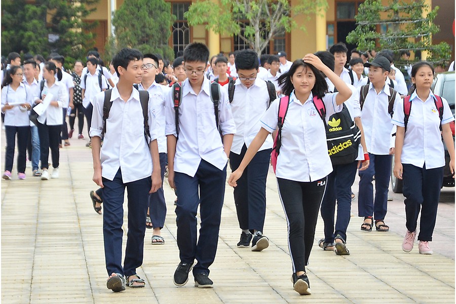 Các thí sinh hoàn thành bài thi môn Ngữ Văn tại hội đồng thi Trường THPT An Dương