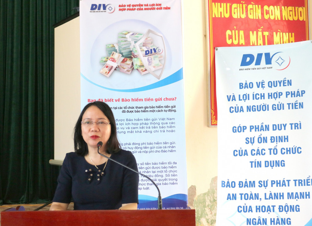 Phó trưởng phòng Tổng hợp BHTG khu vực Đông Bắc Bộ Ngô Thị Chi truyền đạt thông tin về hạn mức chi trả khi tổ chức tham gia BHTG lâm vào tình trạng mất khả năng chi trả hoặc phá sản