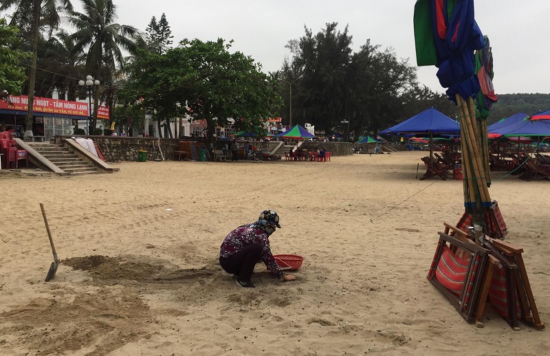 Hộ kinh doanh ở ô số 9, bãi biển khu 2 đang dọn rác tại khu vực kinh doanh