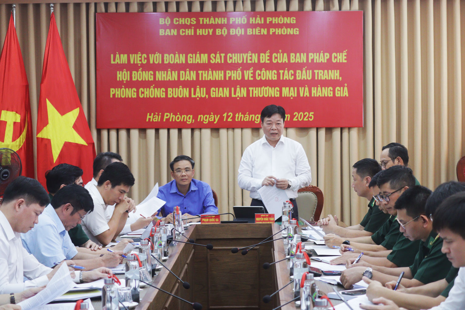 Qua nghe báo cáo và ý kiến của các đại biểu, phát biểu tại cuộc làm việc, đồng chí Phạm Quốc Ka, Trưởng Ban Pháp chế HĐND thành phố đánh giá, thời gian qua, Ban Chỉ huy Bộ đội Biên phòng Hải Phòng đã chủ trì, phối hợp với các lực lượng chức năng đấu tranh có hiệu quả công tác chống buôn lậu, gian lận thương mại và hàng giả ở khu vực biên giới biển, cửa khẩu cảng Hải Phòng, góp phần vào thực hiện thắng lợi nhiệm vụ phát triển kinh tế – xã hội, bảo đảm quốc phòng – an ninh của thành phố.