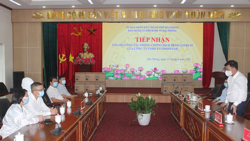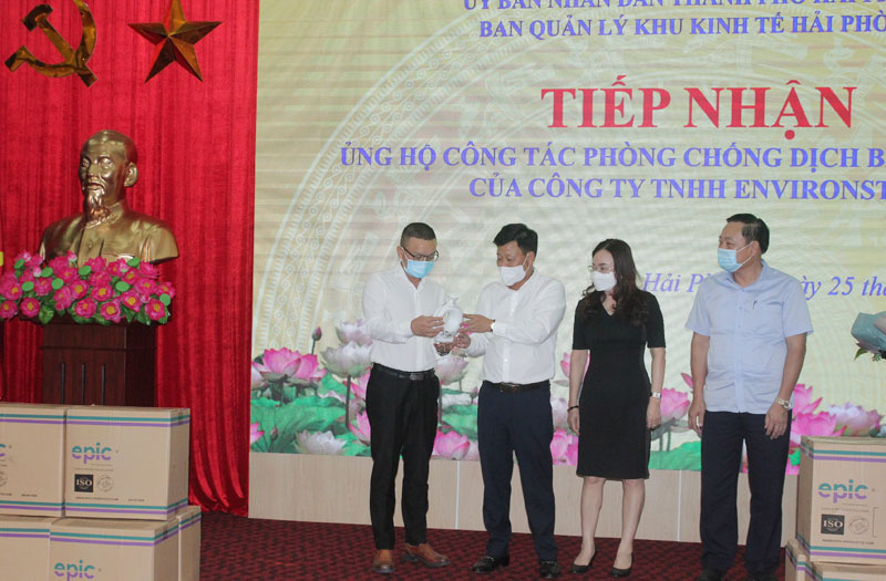 Trước diễn biến phức tạp của dịch bệnh COVID-19 đang diễn ra tại Việt Nam; thực hiện ý kiến chỉ đạo của Thường trực Thành ủy về việc phát động phong trào ủng hộ trang thiết bị vật tư y tế cho công tác phòng, chống dịch của thành phố, chiều 25/8, Ban Quản lý Khu Kinh tế Hải Phòng tổ chức lễ tiếp nhận ủng hộ trang thiết bị vật tư y tế cho công tác phòng, chống dịch bệnh COVID-19 của Công ty TNHH Environstar – Khu công nghiệp Đồ Sơn. Đồng chí Lê Trung Kiên, Ủy viên Ban Thường vụ Thành ủy, Trưởng Ban Quản lý Khu kinh tế Hải Phòng chủ trì buổi tiếp nhận.