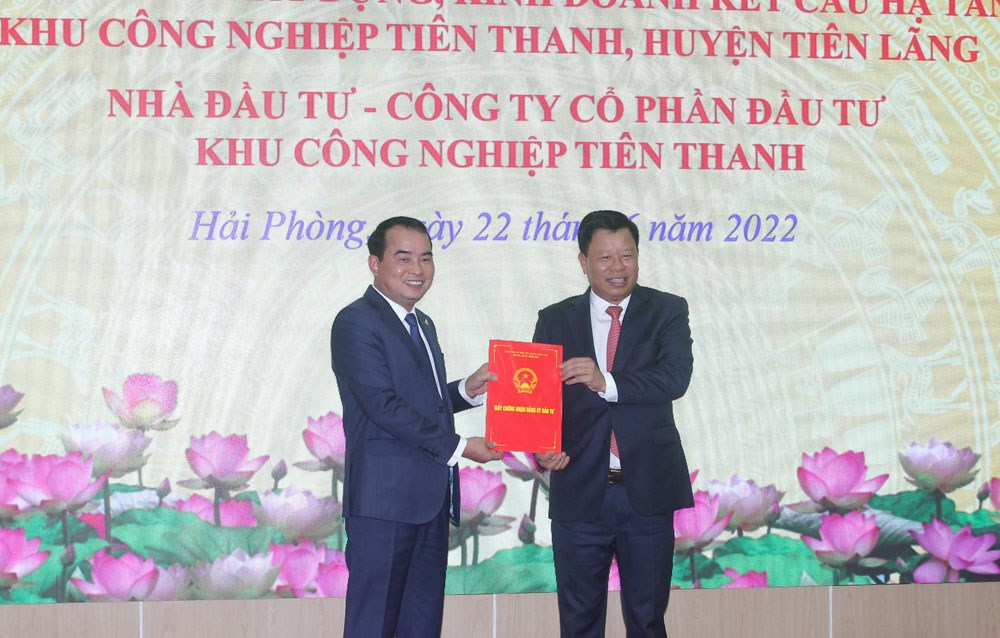 Chiều 22/6, Ban Quản lý Khu kinh tế Hải Phòng tổ chức Hội nghị trao Giấy chứng nhận đăng ký đầu tư cho dự án đầu tư xây dựng và kinh doanh kết cấu hạ tầng Khu công nghiệp Tiên Thanh, huyện Tiên Lãng và các dự án trong Khu công nghiệp, Khu kinh tế Hải Phòng tháng 6 năm 2022.