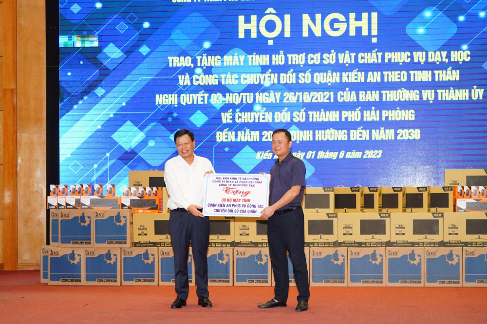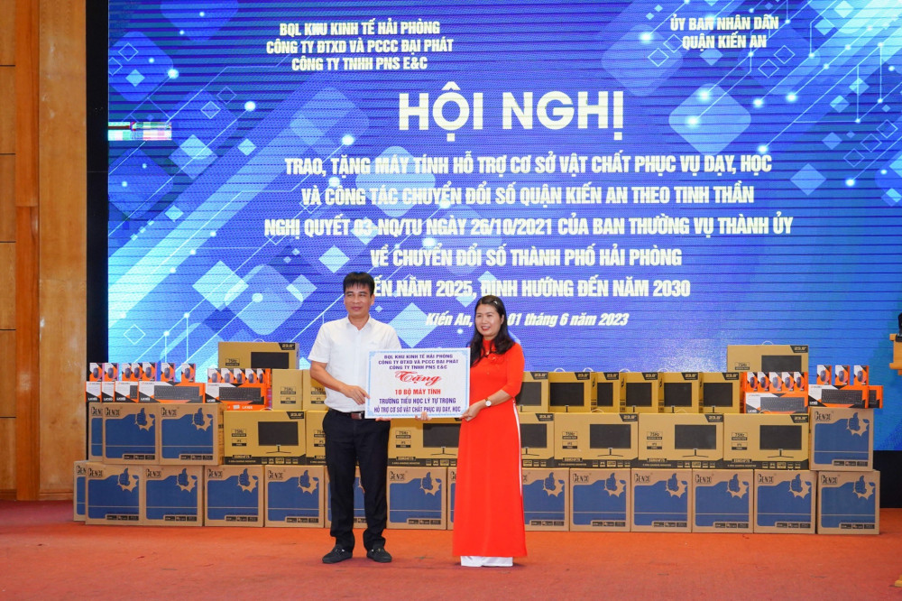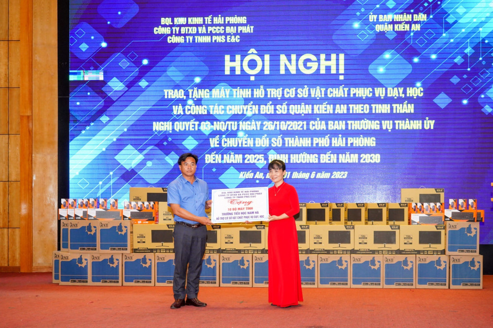 Tại Hội nghị, Ban Quản lý Khu kinh tế Hải Phòng; Công ty Đầu tư xây dựng và Phòng cháy, chữa cháy Đại Phát và Công ty TNHH PNS E&C đã trao, tặng 50 bộ máy tính nhằm đáp hỗ trợ phục vụ dạy, học và công tác chuyển đổi số của quận Kiến An. Trong đó, 30 bộ máy tính được trao, tặng cho quận Kiến An phục vụ công tác chuyển đổi số; 10 bộ máy tính được trao, tặng cho Trường Tiểu học Lý Tự Trọng; 10 bộ máy tính được trao, tặng cho Trường Tiểu học Nam Hà.
