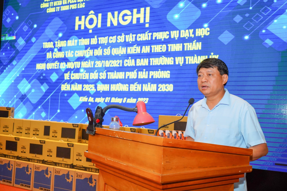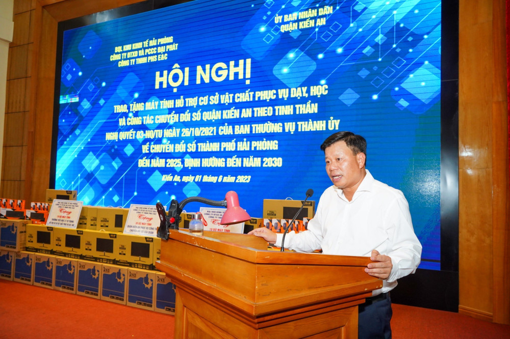 Phát biểu tại Hội nghị, đồng chí Phạm Văn Khanh, Bí thư Quận ủy, Chủ tịch HĐND quận Kiến An cảm ơn sự quan tâm của của Ban Quản lý Khu kinh tế Hải Phòng cùng các doanh nghiệp đã trao tặng máy tính hỗ trợ công tác phục vụ dạy, học và chuyển đổi số của quận. Đồng chí cam kết sẽ lãnh đạo, chỉ đạo sử dụng hiệu quả máy tính được trao, tặng để đẩy nhanh quá trình chuyển đối số của quận, cũng như phục vụ tốt ứng dụng công nghệ thông tin trong công tác dạy và học tại các nhà trường.