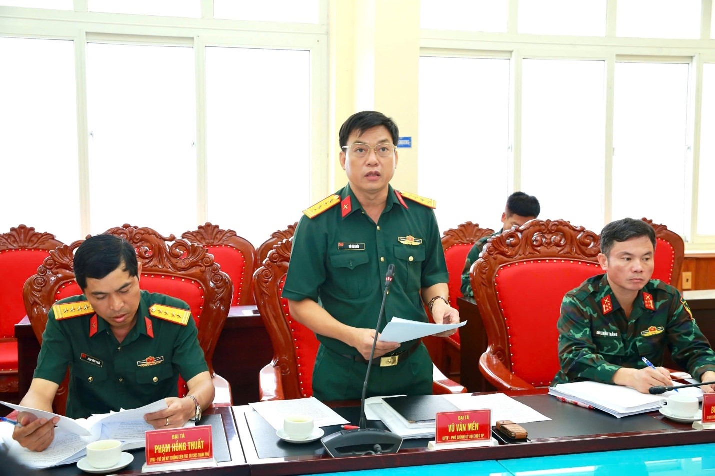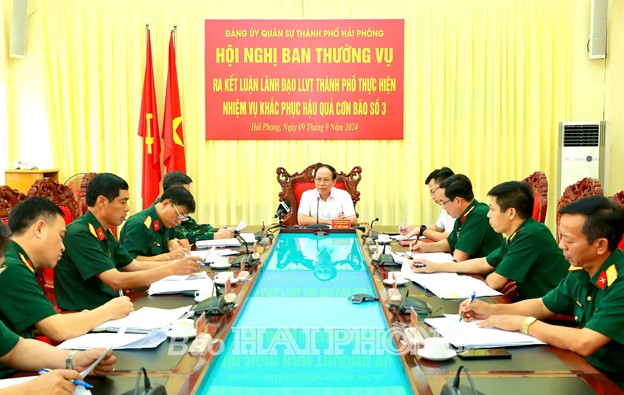 Tại hội nghị, Đại tá Vũ Văn Mến, Phó Chính ủy Bộ CHQS thành phố báo cáo dự thảo kết luận LLVT thực hiện nhiệm vụ khắc phục hậu quả bão số 3. Theo đó, trong những ngày qua, Đảng bộ, chính quyền, quân và Nhân dân thành phố đã tập trung cao độ, với nhiều giải pháp quyết liệt để phòng, chống cơn bão số 3. Thực hiện chức năng đội quân công tác, với tinh thần tham gia phòng, chống thiên tai cũng chính là nhiệm vụ chiến đấu trong thời bình, LLVT thành phố luôn sát cánh cùng các lực lượng phòng chống, khắc phục hậu quả cơn bão. Tuy nhiên, do địa hình giáp biển và với cường độ của siêu bão, diễn biến hết sức phức tạp, thời gian kéo dài cho nên bão số 3 đã để lại hậu quả rất nặng nề trên địa bàn thành phố. Thường vụ Đảng ủy Quân sự thành phố ra kết luận nhằm tập trung cao nhất lực lượng, phương tiện, khẩn trương tham gia khắc phục hậu quả cơn bão. Trong huy động lực lượng, phương tiện phải bảo đảm tuân thủ đúng quy định của pháp luật. Bảo đảm tuyệt đối an toàn về con người, cơ sở vật chất trong quá trình thực hiện nhiệm vụ…