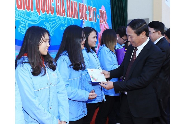 Đồng chí Lê Văn Thành, Ủy viên Trung ương Đảng, Bí thư Thành ủy, Chủ tịch HĐND thành phố trao thưởng các học sinh đoạt giải kỳ thi học sinh giỏi quốc gia năm 2017-2018.
