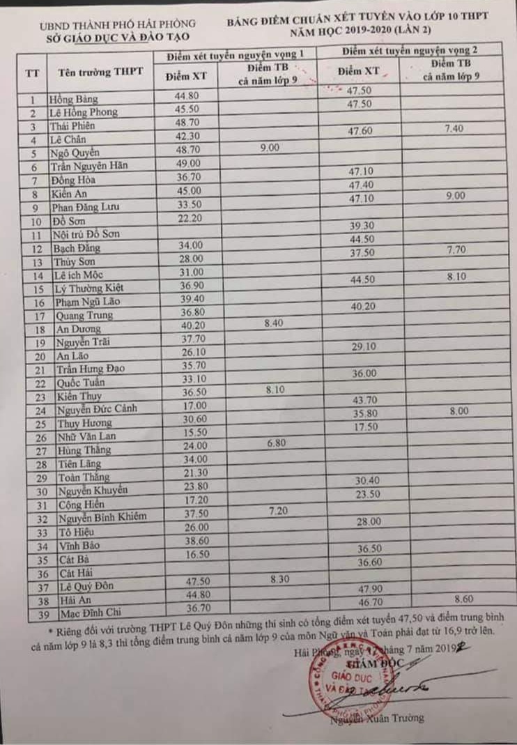 Bảng điểm chuẩn xét tuyển vào Lớp 10 THPT năm học 2019-2020, lần 2