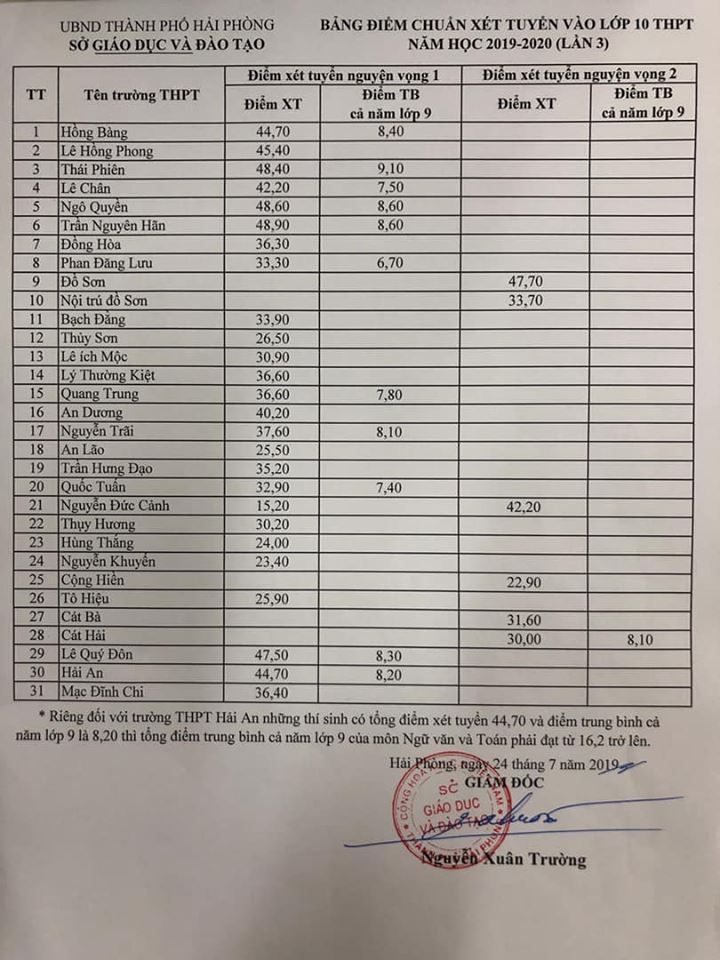 Ngày 24/7/2019, Sở Giáo dục và Đạo tạo đã công bố Bảng điểm chuẩn xét tuyển vào Lớp 10 THPT năm học 2019-2020 – Lần 3; Riêng đối với Trường THPT Hải An những thí sinh có tổng điểm xét tuyển 44,70 và điểm trung bình cả năm lớp 9 là 8,20 thì tổng điểm trung bình cả năm lớp 9 của môn Ngữ văn và Toán phải đạt từ 16,2 trở lên.