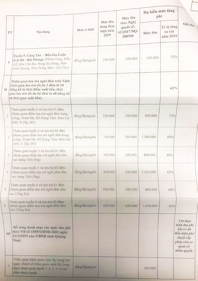 Trong khi đó, tham quan và lưu trú đêm được đề xuất tăng phí mạnh. Theo đó, tuyến 2 và lưu trú 1 đêm từ mức 550.000 đồng/lần/người hiện nay sẽ tăng lên 950.000 đồng (tăng 73%), tham quan tuyến 2 và lưu trú 2 đêm từ 750.000 tăng lên 1.200.000 đồng.