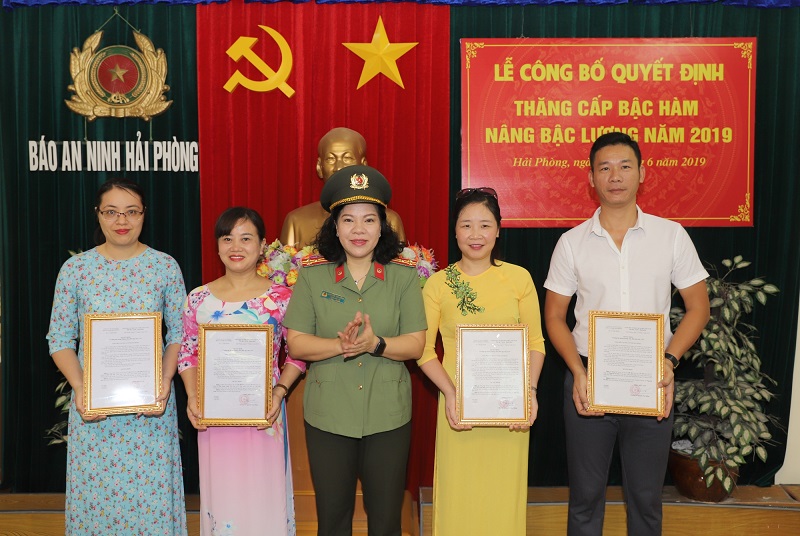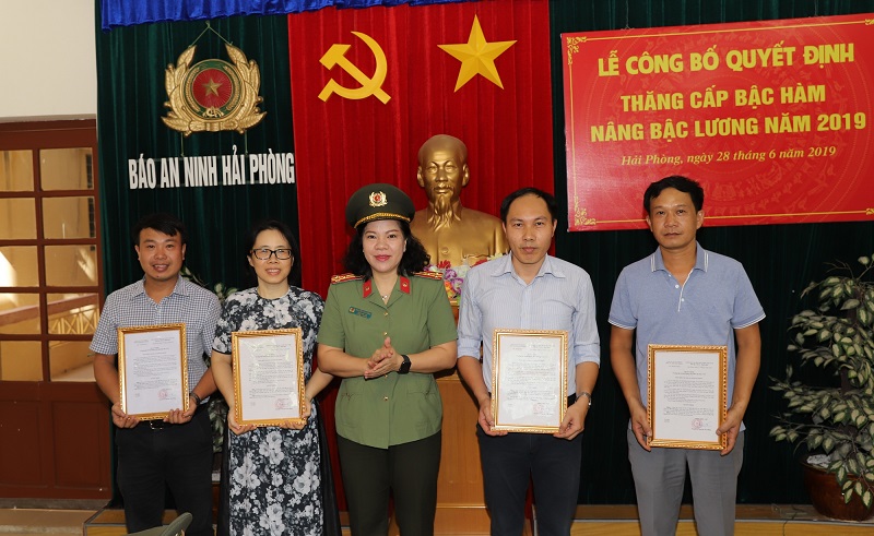 Sáng 28-6, Báo An ninh Hải Phòng tổ chức buổi lễ công bố các quyết định của Bộ trưởng Bộ trưởng Bộ Công an, Giám đốc CATP Hải Phòng và Tổng biên tập Báo An ninh Hải Phòng về việc thăng cấp bậc hàm, nâng bậc lương CBCS, viên chức năm 2019 đang công tác tại đơn vị. Đại tá Nguyễn Quốc Hùng, Phó Bí thư Đảng ủy, Phó Giám đốc CATP đến dự.