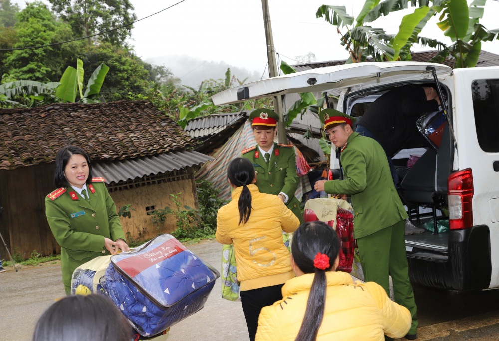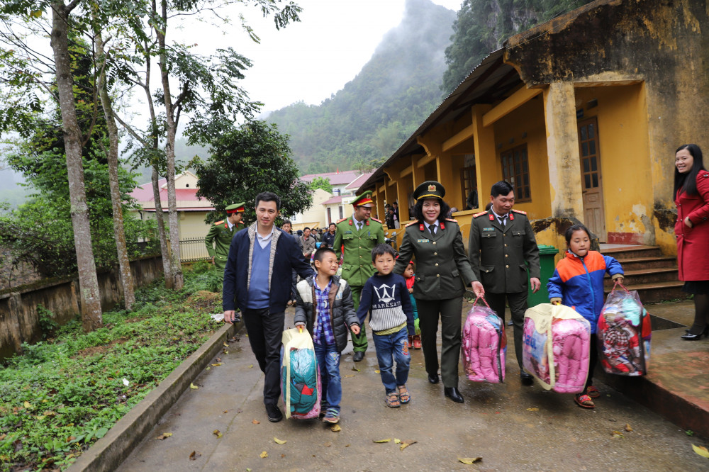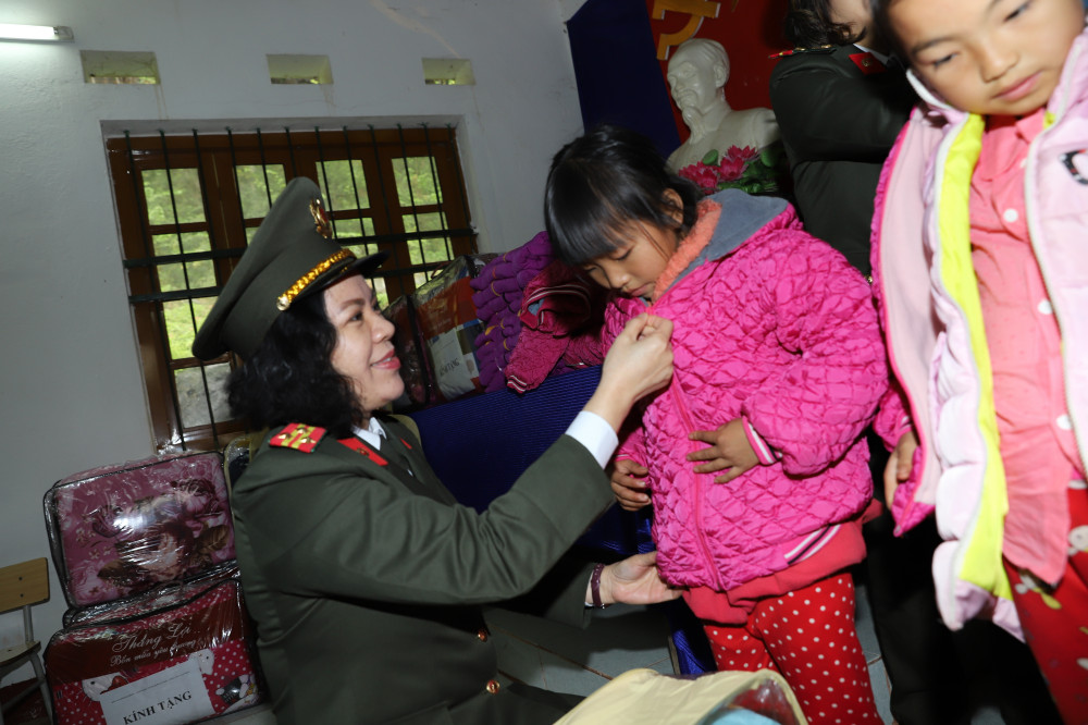 Thượng tá Nguyễn Thu Hồng, Tổng biên tập Báo An ninh Hải Phòng trao những tấm áo ấm tràn đầy tình yêu thương đến các em học sinh trường Tiểu học Nà Sác huyện Hà Quảng, Tỉnh Cao Bằng