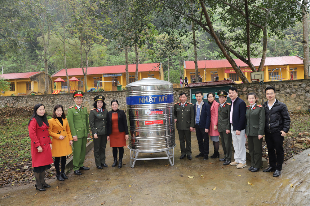 Đoàn công tác tặng téc nước cải thiện sinh hoạt hàng ngày cho cô, trò trường Tiểu học Nà Sác