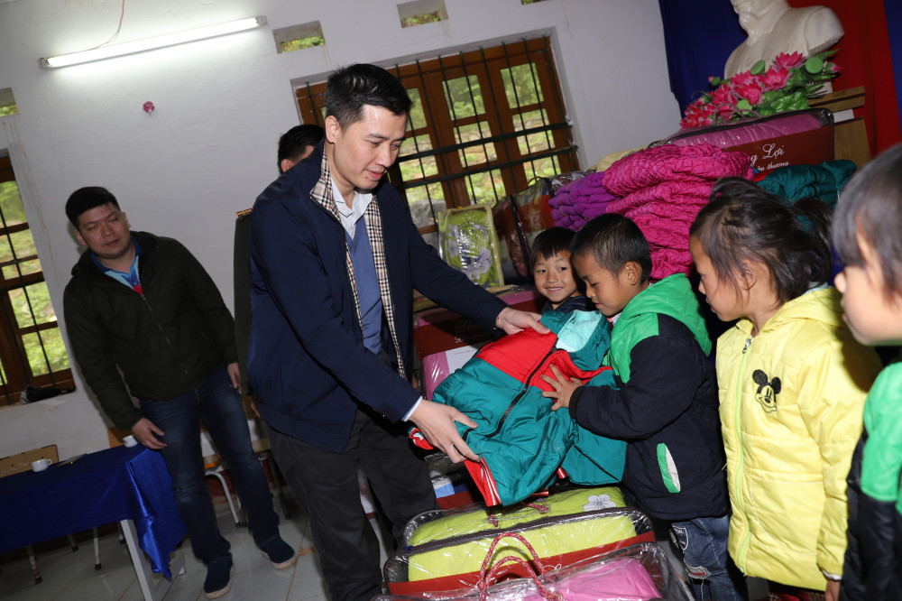 Ông Trần Hoài Nam, Giám đốc Ngân hàng Vietin Bank Lê Chân trao tặng áo ấm đến các em học sinh Trường TH Nà Sác