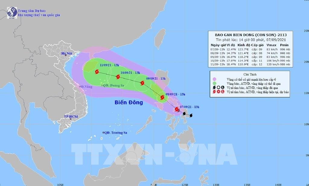 Dự báo, từ 7 giờ ngày 8/9 đến 7 giờ ngày 9/9, bão di chuyển theo hướng Tây Bắc, mỗi giờ đi được 10-15km, đi vào Biển Đông. Đến 7 giờ ngày 9/9, vị trí tâm bão ở khoảng 15,6 độ Vĩ Bắc; 119,4 độ Kinh Đông, cách quần đảo Hoàng Sa khoảng 790km về phía Đông Đông Nam. Sức gió mạnh nhất vùng gần tâm bão mạnh cấp 9 (75-90km/giờ), giật cấp 11.
