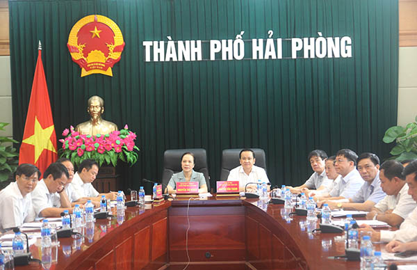 Các đồng chí Nguyễn Thị Nghĩa, Phó bí thư Thường trực Thành ủy; Nguyễn Văn Thành, Phó chủ tịch UBND thành phố dự tại điểm cầu Hải Phòng.