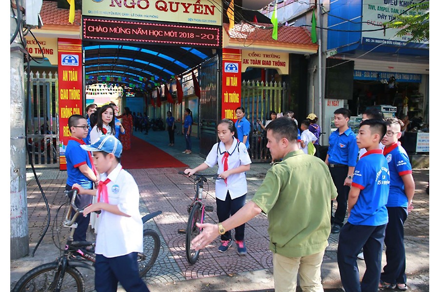 Tại Trường THCS Ngô Quyền (quận Lê Chân), chị Nguyễn Thùy Linh, Tổng phụ trách thông tin: Ngay từ đầu năm học mới, nhà trường lên kế hoạch củng cố, đẩy mạnh các giải pháp giảm ách tắc giao thông vào giờ tan học. Theo đó, nhà trường không chỉ bố trí nơi phụ huynh đỗ xe đợi đón con 2 bên vòm mái che, mà còn tiến hành “phân luồng” giao thông ngay trong trường. Nhà trường và lực lượng công an hướng dẫn học sinh đi thành 2 làn đi bộ và đi xe đạp nhằm giảm lượng học sinh cùng một lúc đổ ra đường. Số học sinh đi bộ được xếp hàng ra về trước để giải tỏa lượng phụ huynh chờ đón con cách trường 20 mét theo quy định. Sau đó, số học sinh đi phương tiện xe đạp, xe đạp điện, phụ huynh đợi đón con trong trường mới tiếp tục ra về; theo một hướng ra cổng trường rồi rẽ phải; tránh việc các phương tiện quay đầu ngay tại khu vực cổng trường để sang đường gây ùn ứ giao thông.