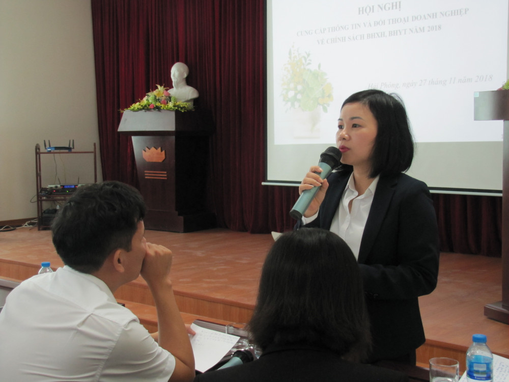 Giám đốc BHXH quận Hồng Bàng Nguyễn Tường Vân nhấn mạnh việc tăng cường đối thoại nhằm nâng cao hiểu biết và tạo sự đồng thuận của doanh nghiệp trong thực hiện các chính sách BHXH, BHYT