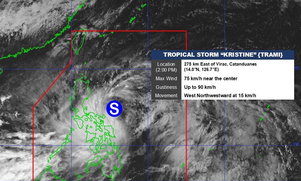 Tin bão mới nhất của Cục Quản lý Thiên văn, Địa vật lý và Khí quyển Philippines (PAGASA) cho hay, vào hồi 14h ngày 22.10, vị trí tâm bão Trà Mi (tên địa phương là Kristine) ở vào khoảng 14 độ vĩ bắc, 126,7 độ kinh đông, trên vùng biển phía đông miền Trung Philippines, cách Virac, Catanduanes 275km về phía đông.