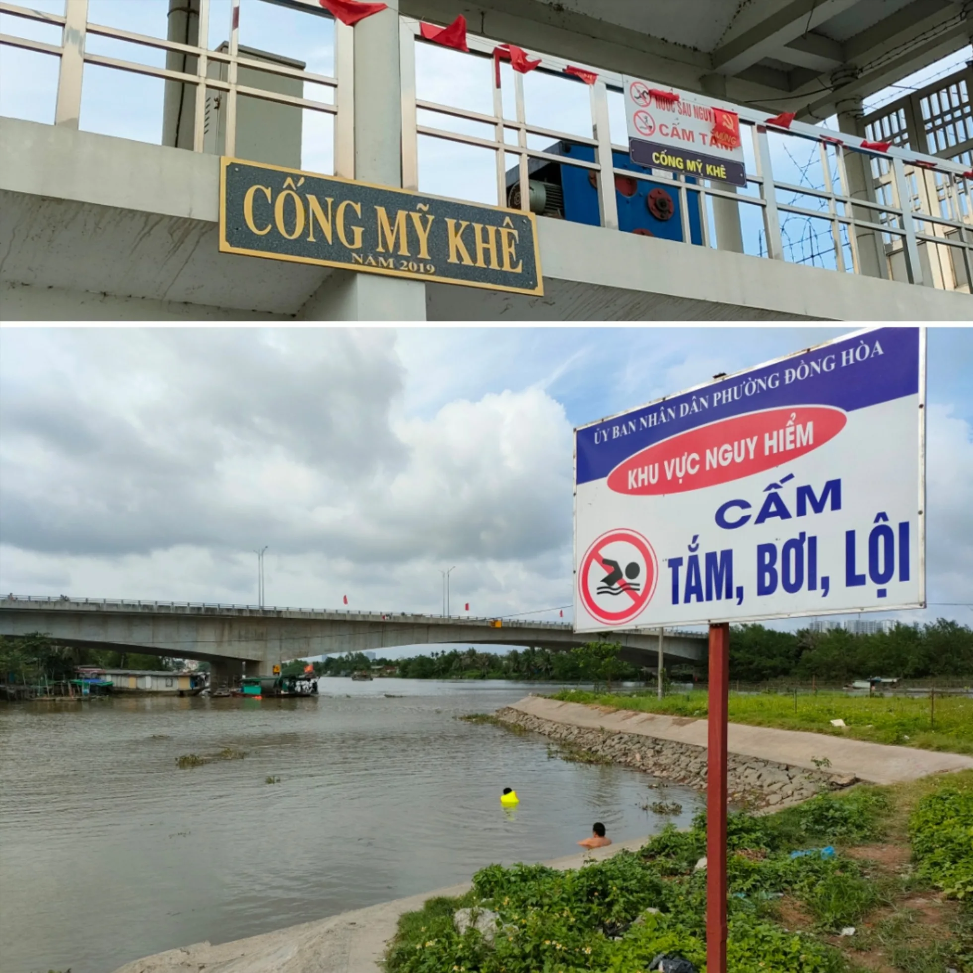 Chị Nguyễn Thị Lam, người dân phường Đồng Hoà cho biết: Khoảng một tháng nay, chiều nào ở cống Mỹ Khê cũng có đến cả trăm người đến bơi, lội, trong đó có nhiều người mang cả con nhỏ đến tắm, tập bơi. “Biển cấm nguy hiểm thì ai cũng thấy, nhưng khu vực này xa các bể bơi, lại có bờ kè đá chắc chắn nên người dân tiện cho con em ra đây bơi“, chị Lam cho biết.