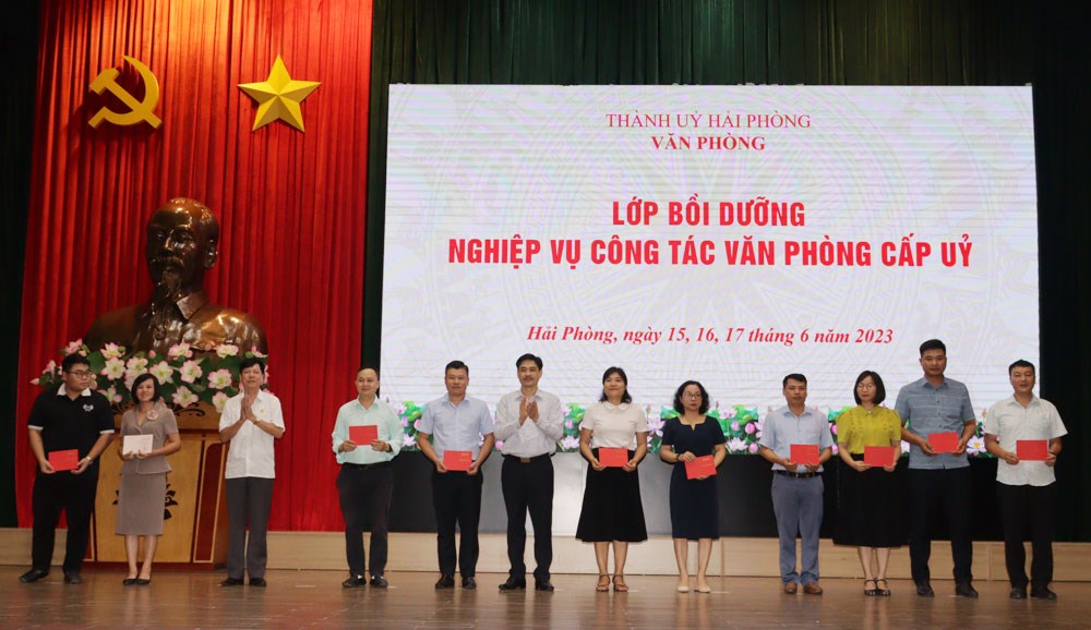 Sáng 17/6, tại Trường Chính trị Tô Hiệu, Văn phòng Thành ủy tổ chức bế mạc Lớp bồi dưỡng nghiệp vụ văn phòng cấp ủy và công tác bảo vệ bí mật nhà nước năm 2023.