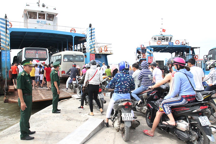 Các phương tiện nối đuôi nhau chờ lên phà.