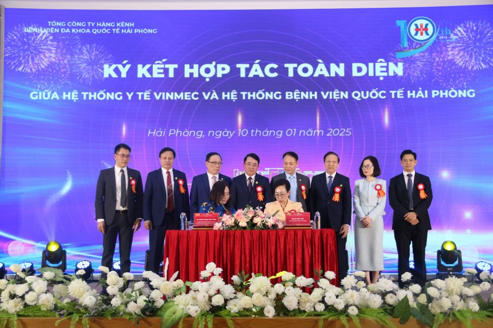 Tại chương trình cũng diễn ra nghi thức ký kết hợp tác toàn diện giữa Hệ thống Y tế Vinmec và Hệ thống Y tế Quốc tế Hải Phòng đã chính thức hoàn thành, mở ra một chương mới đầy triển vọng và ý nghĩa. Đây không chỉ là một dấu mốc trong hành trình phát triển của cả hai hệ thống, mà còn là minh chứng rõ nét cho tầm nhìn chiến lược, sự đoàn kết và khát vọng vươn cao vì sức khỏe cộng đồng.