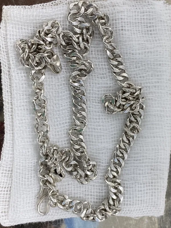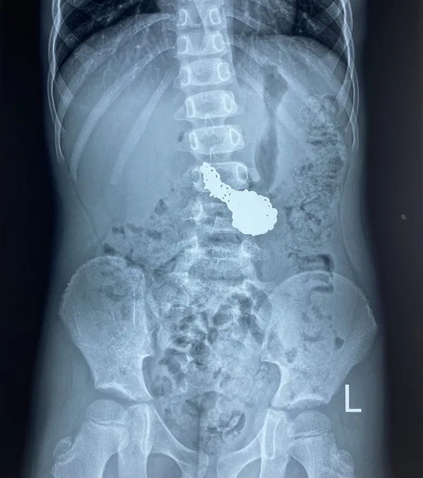 Điều may mắn là gia đình phát hiện và đưa cháu đến viện kịp thời, sợi dây chuyền bạc vẫn nằm ở dạ dày, chưa xuống đến hành tá tràng và ruột non nên chưa gây ra những biến chứng nguy hiểm như tắc ruột, ảnh hưởng nghiêm trọng đến tình trạng sức khỏe cháu bé.