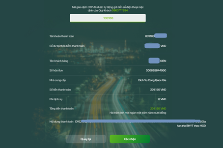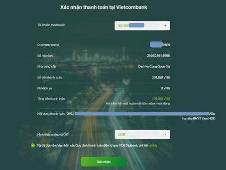 + Hệ thống sẽ hiển thị lại thông tin thanh toán một lần nữa để xác nhận. Nếu các thông tin đã chính xác, nhấn vào nút “Xác nhận”.
