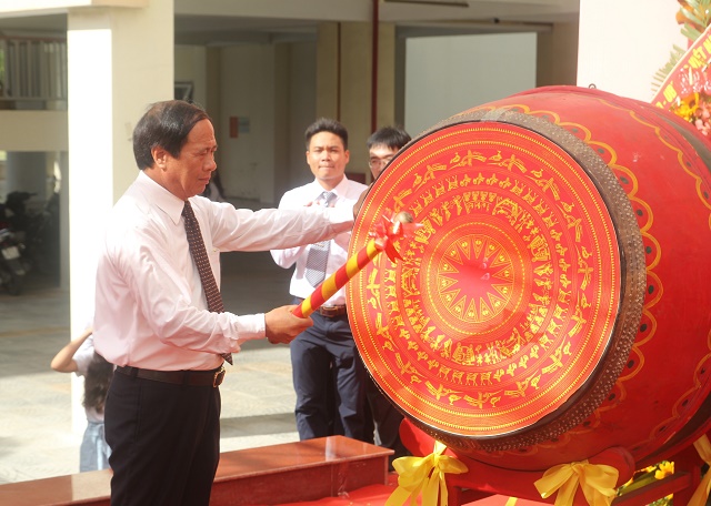 Đồng chí Lê Văn Thành, Bí thư Thành ủy, Chủ tịch HĐND thành phố đánh trống khai giảng năm học mới.