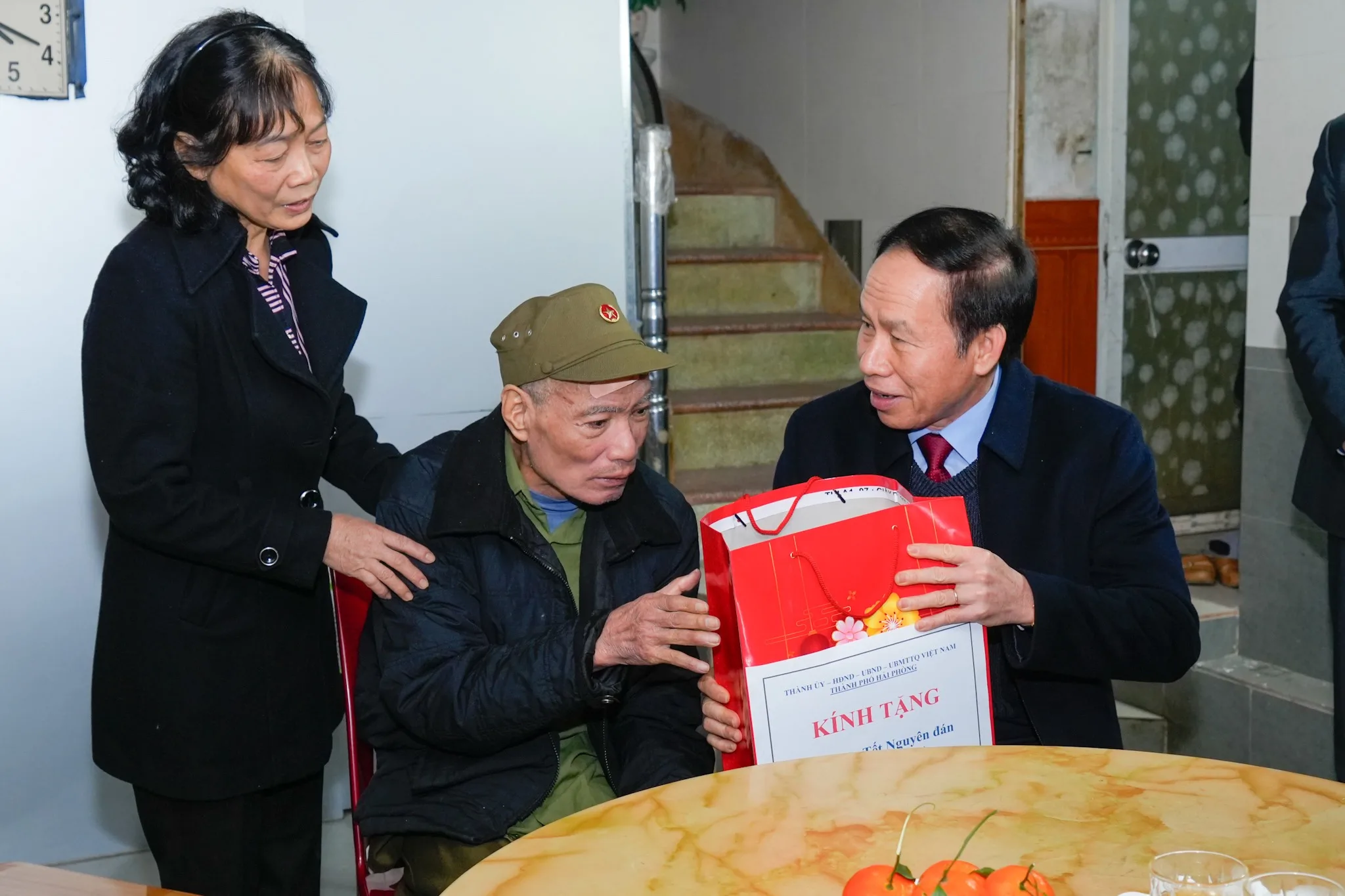 Đồng chí Bí thư Thành ủy đến thăm, tặng quà ông Vũ Nghiễn, sinh năm 1935, là bố liệt sĩ Vũ Hồng Vân, đồng thời là thương binh hạng 4/4, tỷ lệ tổn thương cơ thể 27%, tại số 64 đường Nguyễn Văn Hới, phường Cát Bi, quận Hải An và thăm, tặng quà ông Phạm Văn Thao, sinh năm 1950, là thương binh hạng 3/4, tỷ lệ tổn thương cơ thể 43%, tại số 78 đường Cát Bi, Tổ dân phố số 4, phường Thành Tô, quận Hải An.