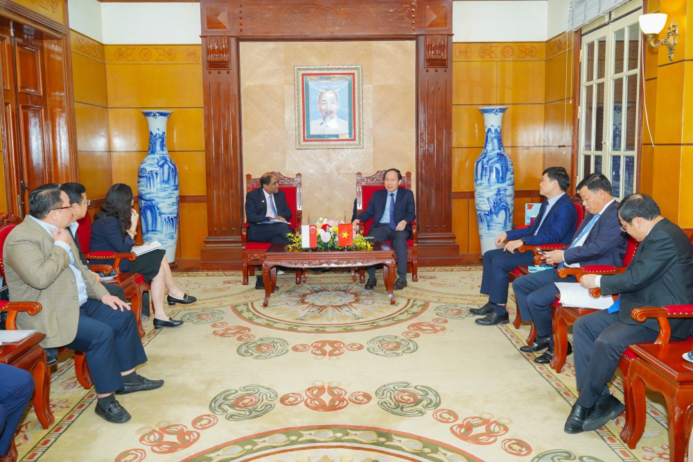 Đặc biệt, Khu Công nghiệp VSIP tại huyện Thuỷ Nguyên đã trở thành biểu tượng hợp tác từ năm 2010 và càng ngày càng chứng minh được tính hiệu quả. Tiềm năng của Hải Phòng còn nhiều và cũng phù hợp với các thế mạnh của Singapore như: công nghiệp xanh, chuyển đổi số, quản lý đô thị và năng lượng tái tạo… Đối với các lĩnh vực: cảng biển, logistic, đóng tàu, giáo dục, y tế… Hải Phòng cũng có nhiều tiềm năng và dư địa phát triển. Vì vậy đồng chí Bí thư Thành ủy mong muốn ngài Đại sứ sẽ là cầu nối giữa Hải Phòng với các địa phương, doanh nghiệp của Singapore có kinh nghiệm trong những lĩnh vực này. Nhất là trong đào tạo nguồn nhân lực, bắt đầu từ phổ thông, đại học cho tới đào tạo nghề; tạo điều kiện để du học sinh Hải Phòng tới Singapore học tập.