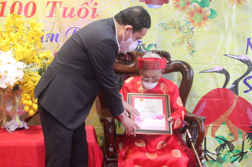 Đồng chí Trần Lưu Quang, Bí thư Thành ủy trao Thiếp mừng thọ và quà của Chủ tịch nước cho cụ Nguyễn Hữu Hãn.